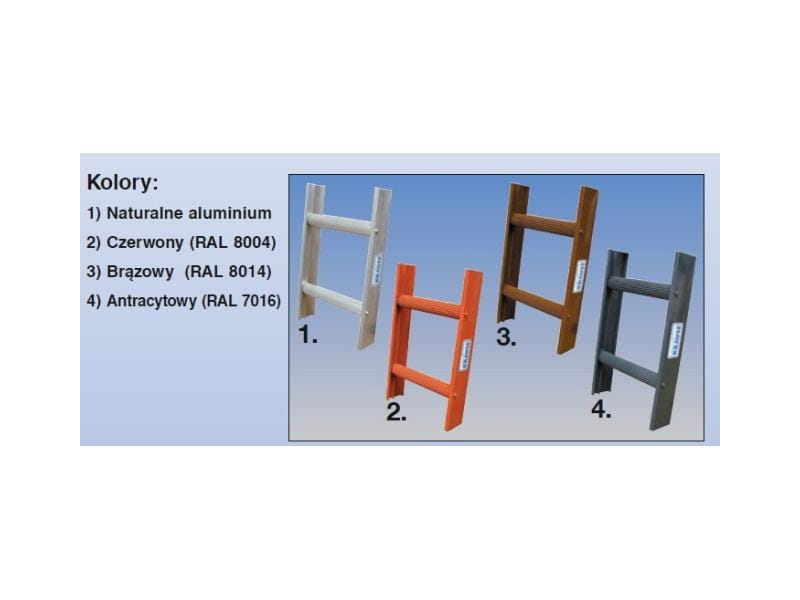 Aluminiowe drabiny kominiarskie. Dostępne w czterech kolorach: aluminium naturalne, czerwony, brązowy, antracytowy.