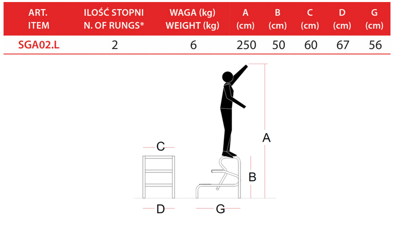 - Wysokość robocza drabiny w zależności od modelu 250 – 298 cm,