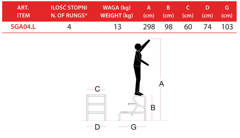 - Wysokość robocza drabiny w zależności od modelu 250 – 298 cm,