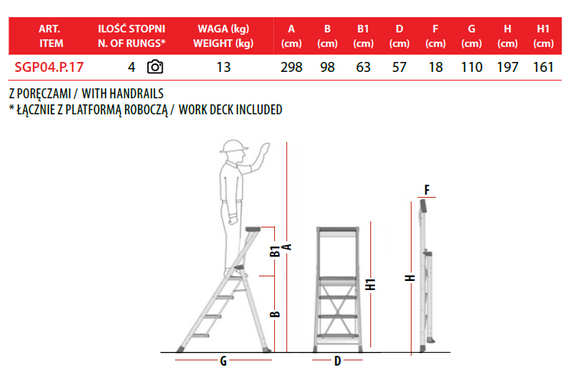 - Wysokość robocza w zależności od modelu 250 – 275 cm bez poręczy oraz trzema 273-329 z poręczami, w zależności od wysokości schodów.