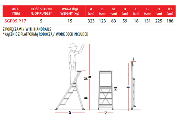 - Wysokość robocza w zależności od modelu 250 – 275 cm bez poręczy oraz trzema 273-329 z poręczami, w zależności od wysokości schodów.