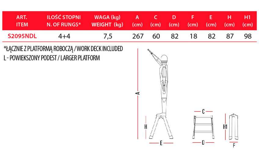 - Wysokość robocza w zależności od modelu 245 – 298 cm,