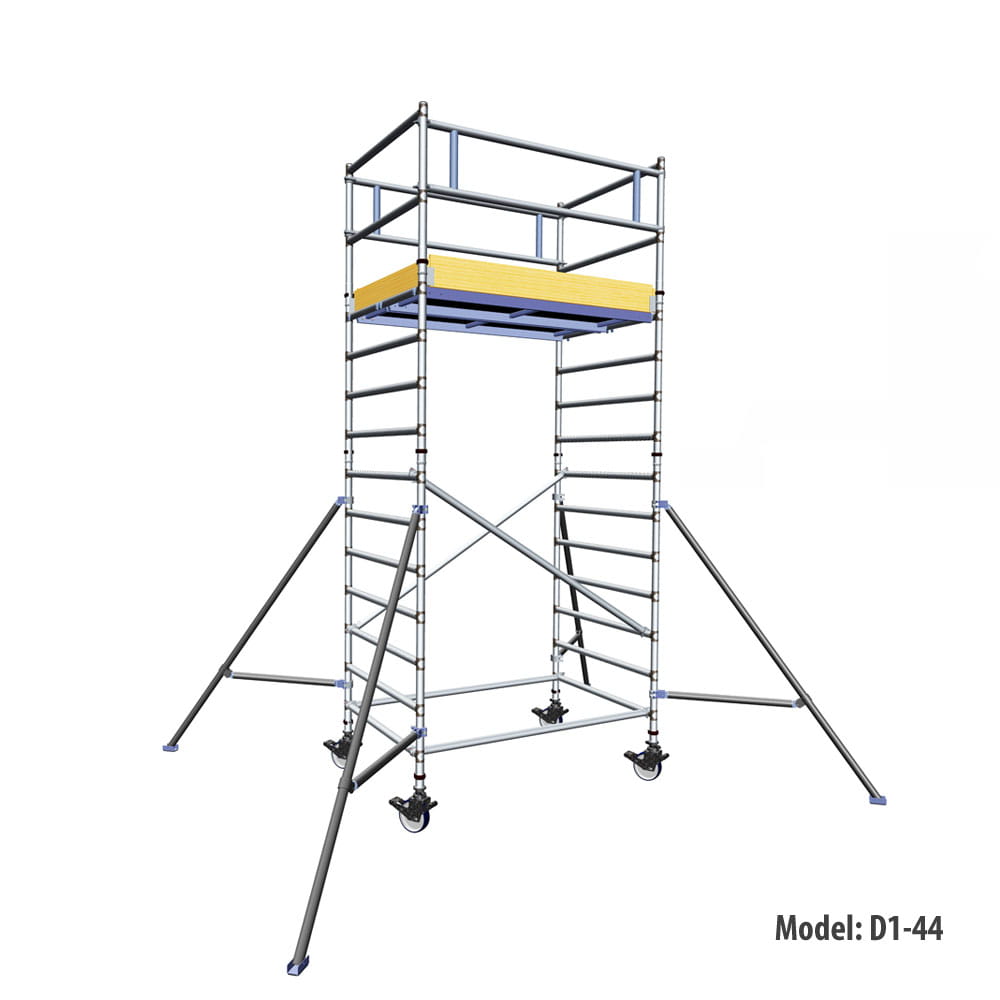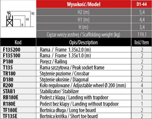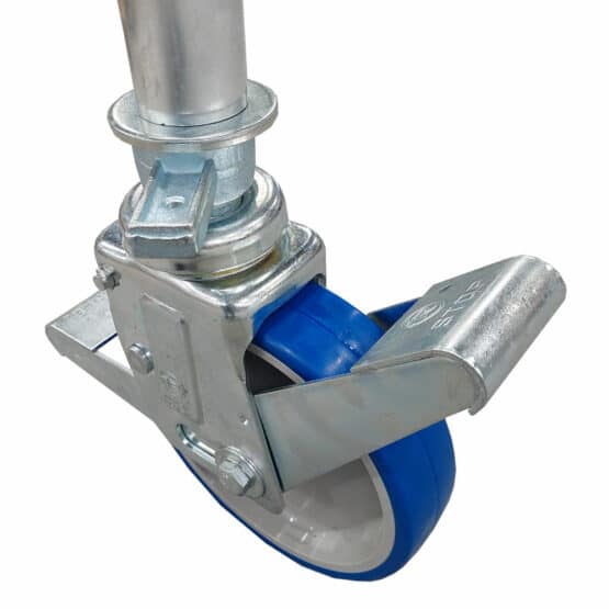 • Wieża jest wyposażona w koła o wysokiej wytrzymałości, z osiowym hamulcem o średnicy 200 mm i systemem poziomowania.
