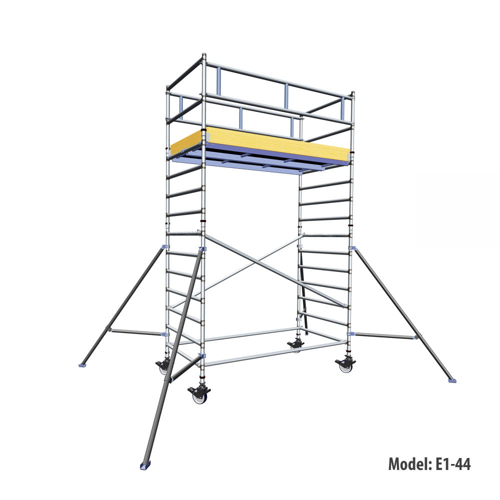 • Wieża jezdna jest wyposażone w koła o wysokiej wytrzymałości, z osiowym hamulcem o średnicy 200 mm i systemem poziomowania.