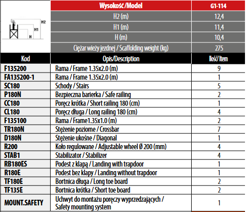 Główne cechy wieży jezdnej 135×180 cm ze schodami: